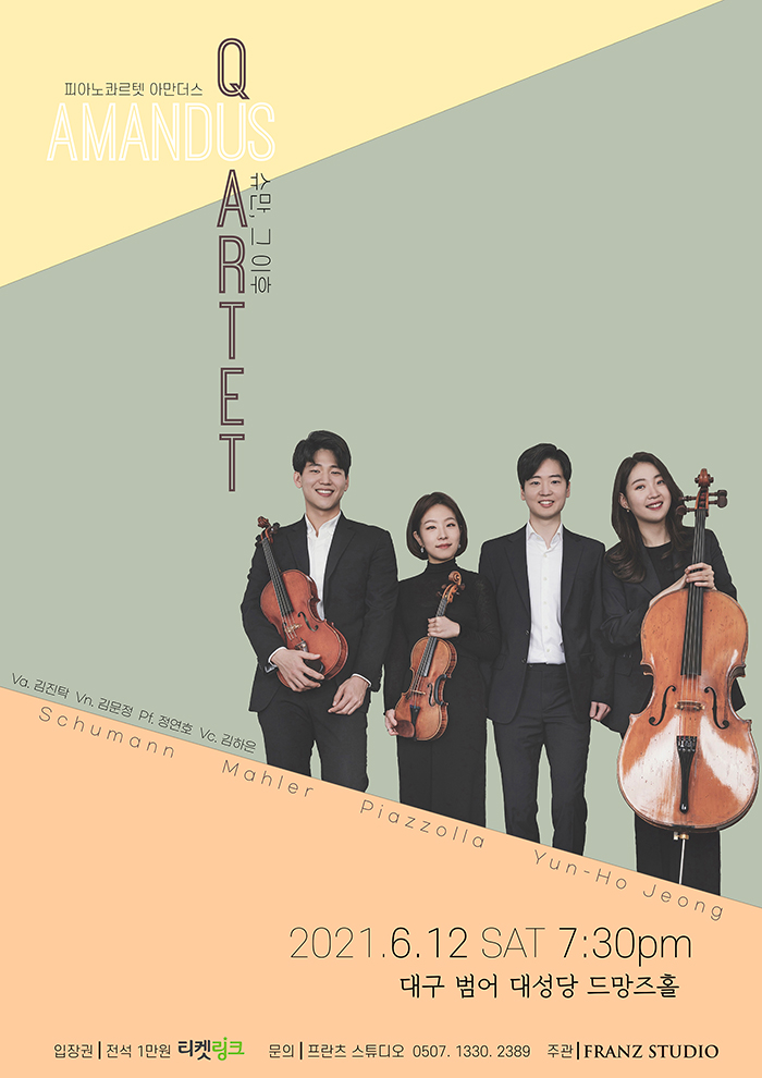 아만더스 콰르텟은 영국에서 공부하던 한국 음악도들이 만나 2020년에 결성된 피아노 4중주단으로 아만더스(Amandus)는 라틴어로 ‘사랑받다’라는 뜻입니다. 서울을 중심으로 활동하고 있는 아만더스 콰르텟이 처음으로 대구를 찾아 슈만의 아름다우면서 그의 실내악곡 중 대중적인 피아노 4중주를 중심으로 말러, 피아졸라 등 흔히 잘 연주되지 않는 곡들까지 한 무대에서 선보일 예정이고, 특히 콰르텟 맴버 중 작곡가 겸 피아니스트 정연호가 아만더스 콰르텟을 위해 쓴 피아노 4중주곡이 초연될 예정입니다.