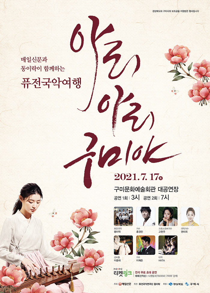 콘서트 〈2021년 매일신문과 동이락이 함께하는 퓨전국악여행 아리아리 구미야〉 티켓오픈 안내입니다.
