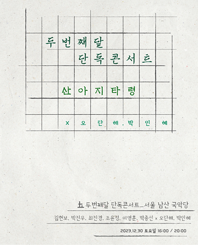 2003년 밴드 결성 이후 20년 동안 꾸준한 활동을 통해 사랑받았던 월드뮤직밴드 두번째달이 2023년 12월 30일(토요일) 서울 한옥마을 내에 위치한 남산국악당에서 단독 콘서트를 개최한다.최근 발매된 새로운 앨범 ‘산아지타령’의 발매기념 공연이자 2023년 한 해 동안 펼쳐왔던 두번째달의 다양한 활동들을 정리해 선보이는 이번 공연은 국악공연 전용 극장인 남산국악당에서 펼쳐지는 만큼 다양한 뮤지컬 활동의 주연과 더불어 2022년 jtbc의 풍류대장을 통해 대중들에게 얼굴을 알린 소리꾼 오단해, 그리고 장르를 넘나드는 다수의 창작판소리를 통해 작창, 각색, 연출, 음악감독과 배우로서 재능을 겸비한 소리꾼 박인혜가 참여하여 월드뮤직 밴드로서 국악과의 다양한 접점을 모색해 온 두번째달 프로젝트의 완성도를 한껏 높일 예정이다.